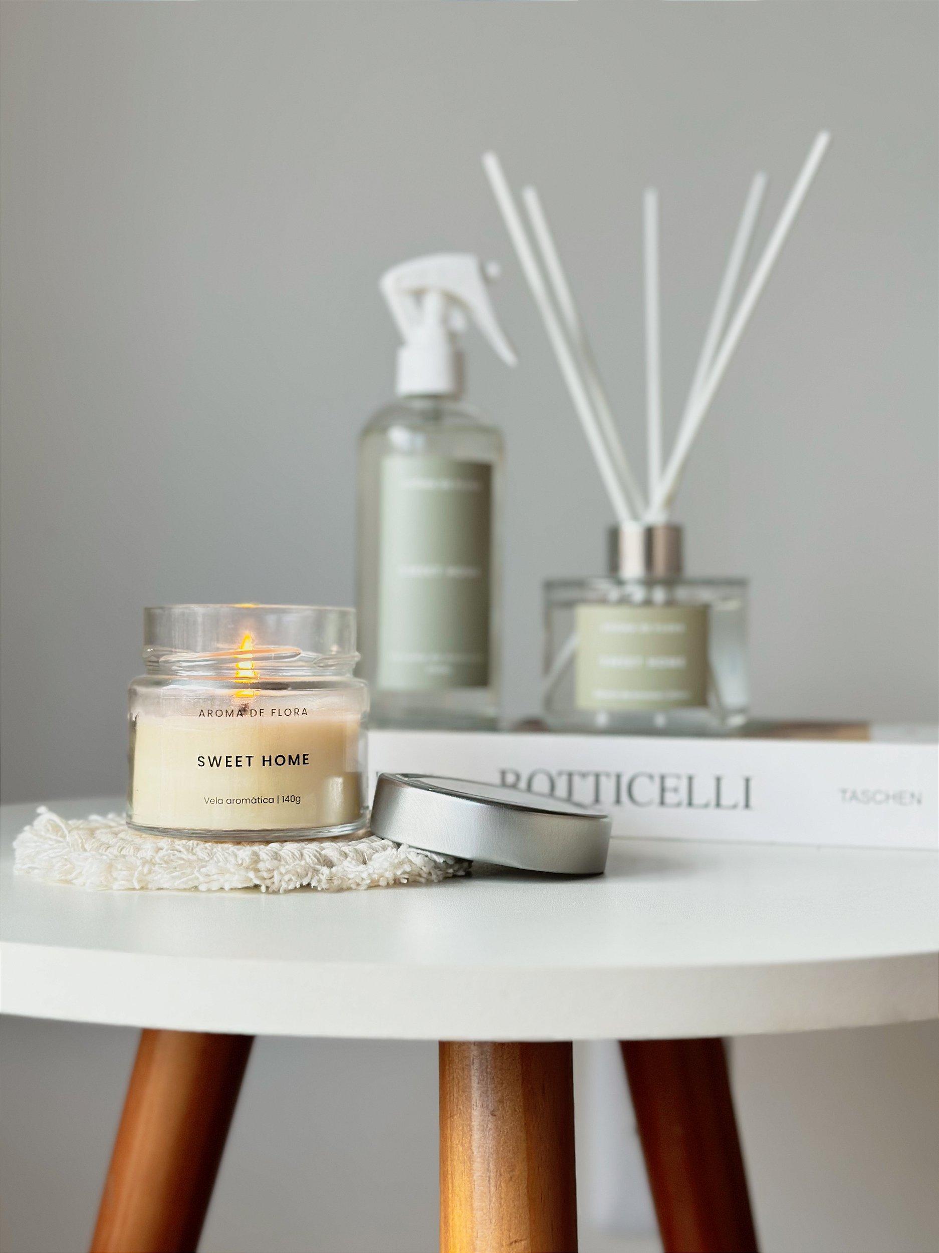 Nosso kit contém 3 itens: Difusor de aromas, home spray e vela aromática.