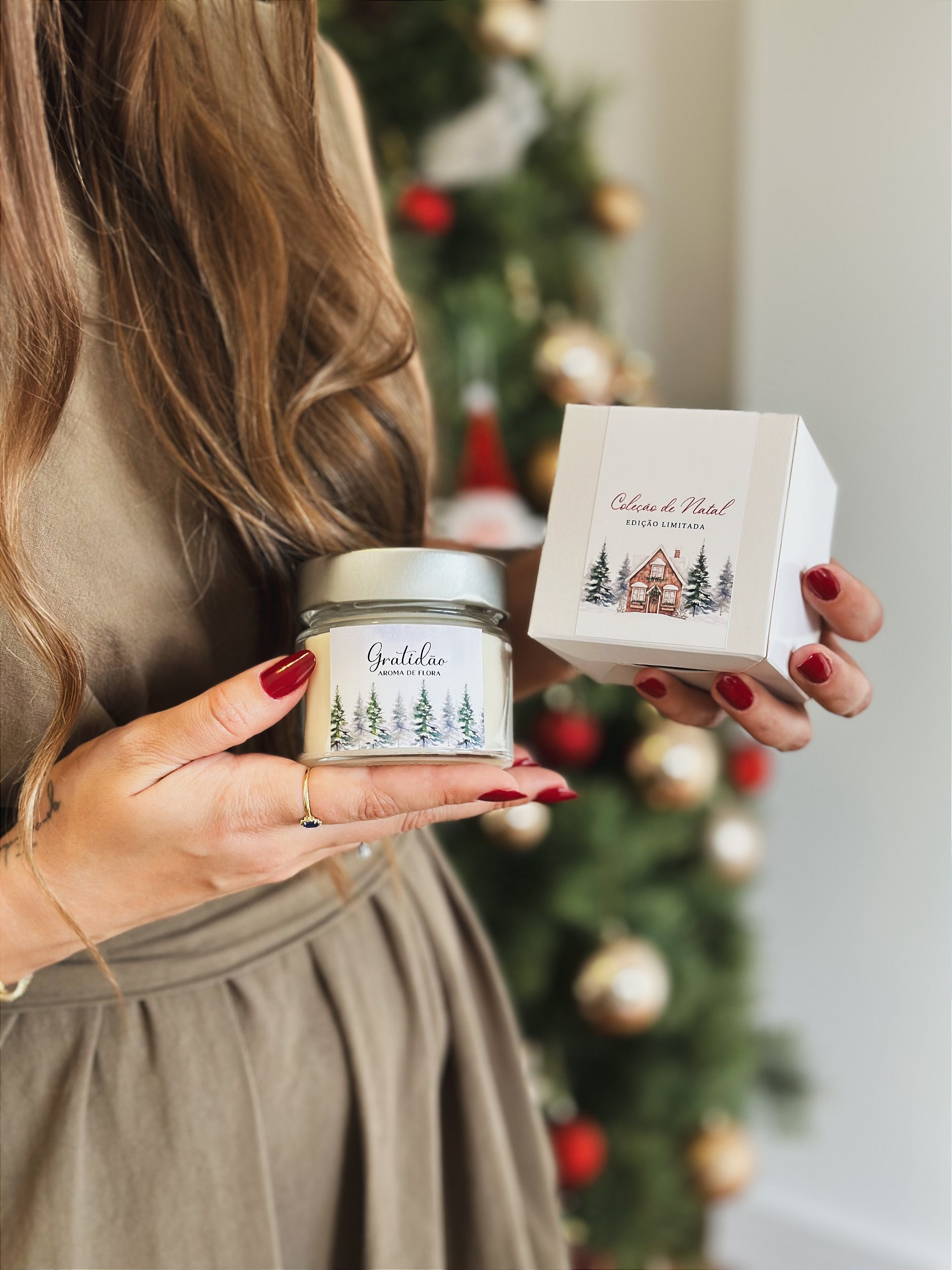 A vela acompanha caixa personalizada de natal.